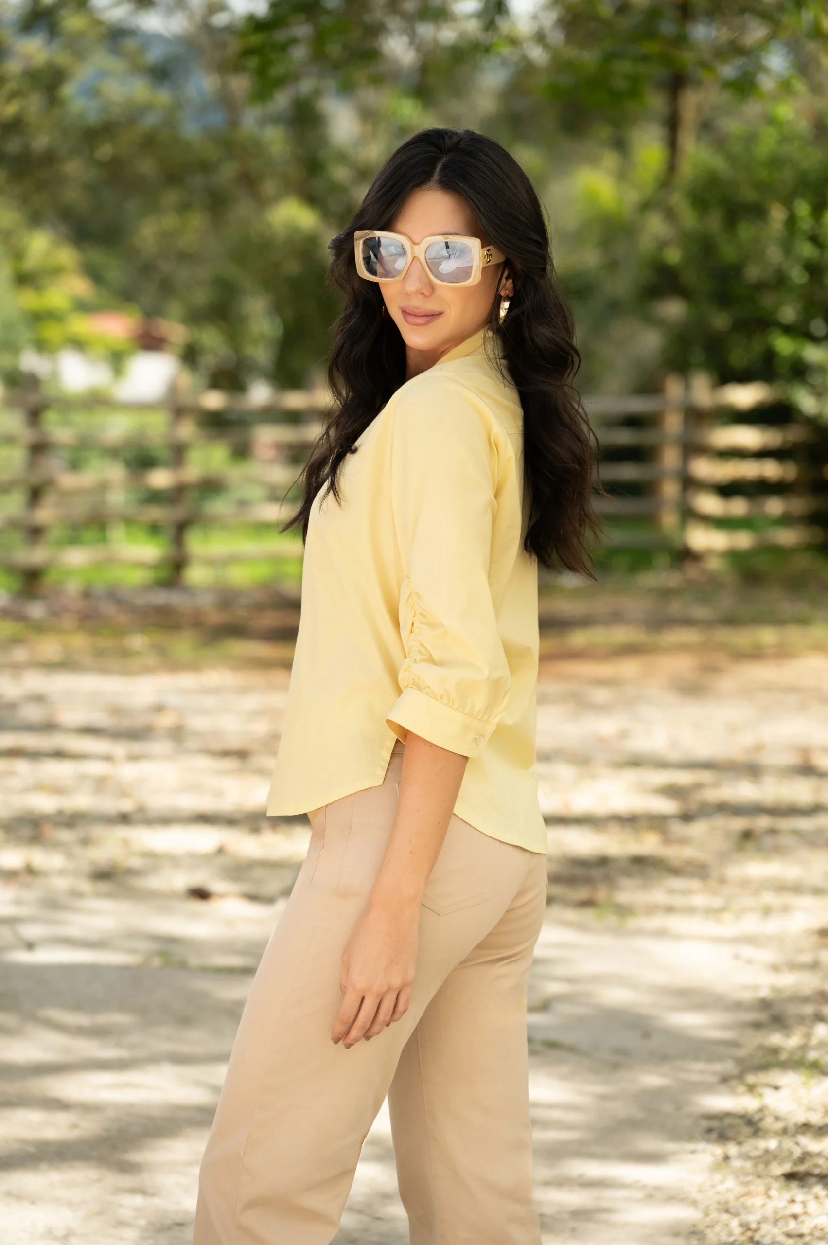 Blusa manga 3/4, elástico decorativo, botones en frente, cuello camisero