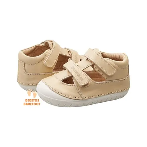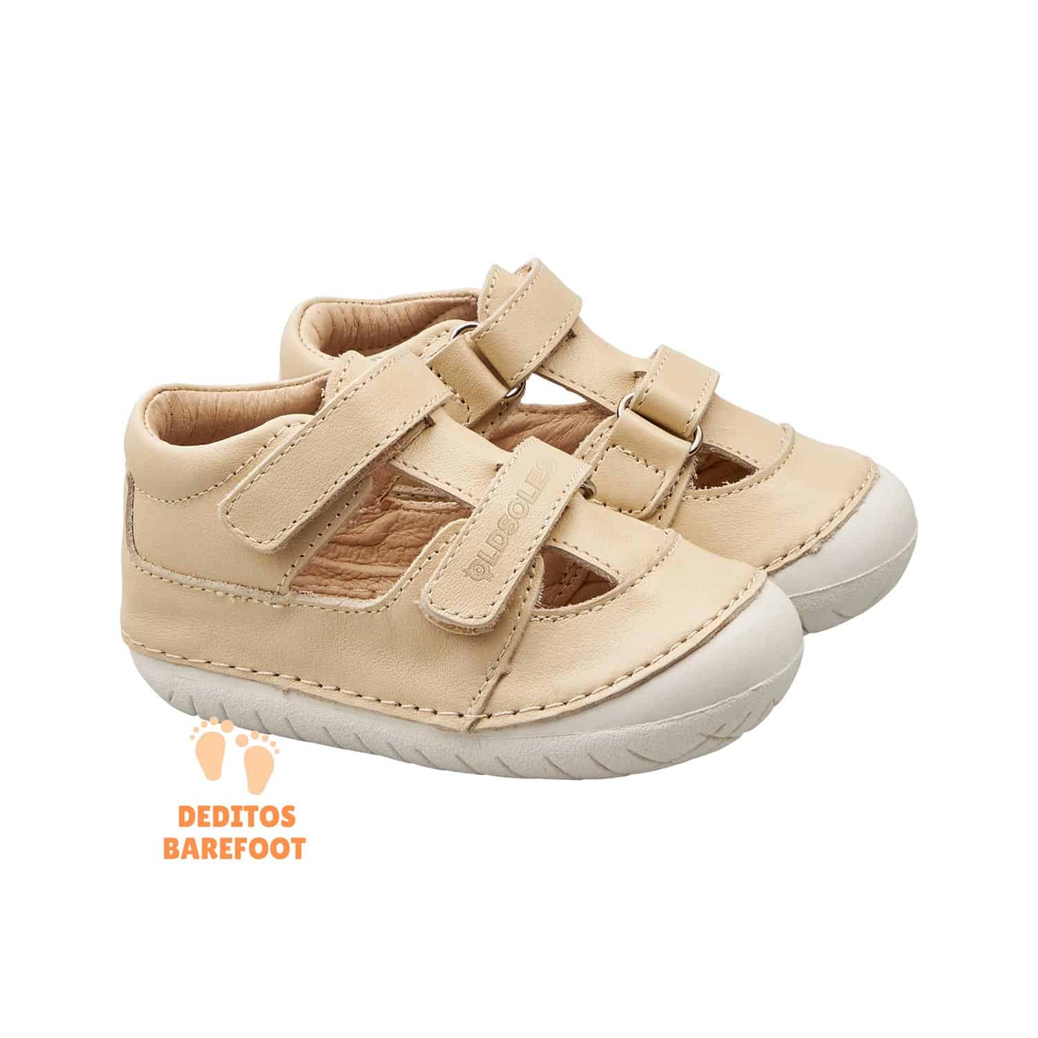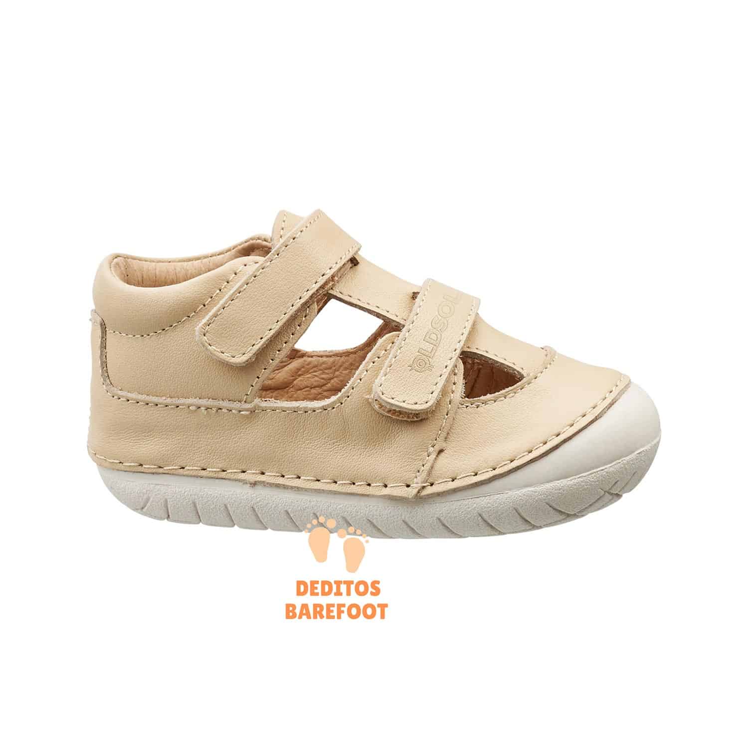 Nuevo modelo de zapatos respetuosos abiertos para primeros pasos de OldSoles para todo la temporada primavera-verano aunque se puede usar para todo el año si lo usa con calcetines o similar, en esta ocasión OldSoles ha fabricado estos zapatos abiertos en piel lisa de color crema y con la suela blanca/gris.