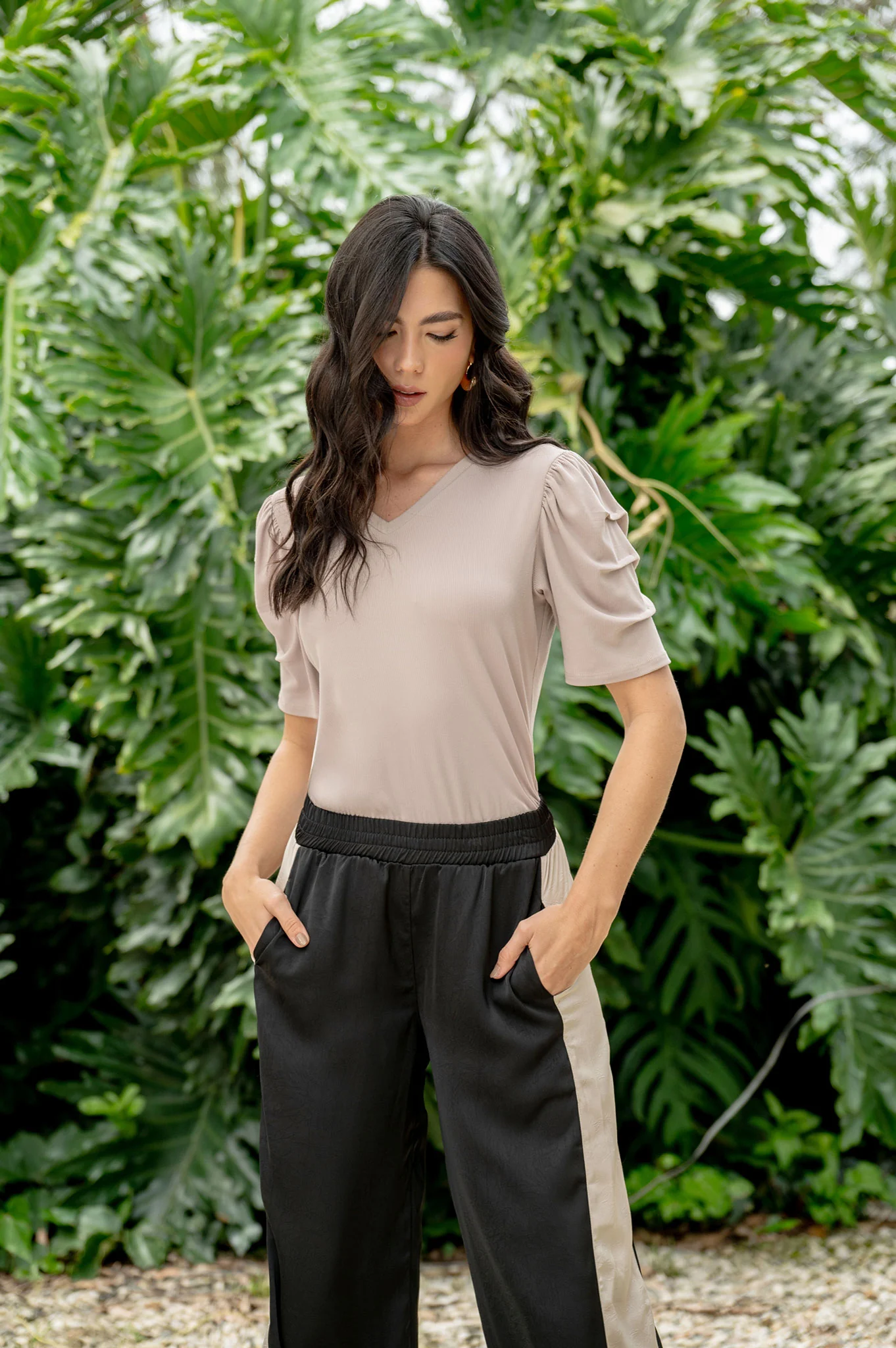 Camiseta manga 3/4 cuello en «V» con recogido en manga