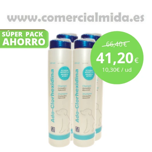El champú Ado Clorhexidina es un gel de baño para perros con pioderma canina, una infección bacteriana de la piel causada por el Staphylococcus intermedius. Este champú Ado Clorhexidina está formulado para aliviar la piel de los perros con pioderma canina que gracias a su propiedad antibacteriana calmará el picor causado por esta enfermedad cutánea que provoca úlceras o costras. La pioderma canina es una de las enfermedades de piel más comunes en los perros y puede ser superficial o profunda. Algunas de las causas conocidas pueden estar vinculadas con la intolerancia a ciertos ingredientes de los piensos convencionales.