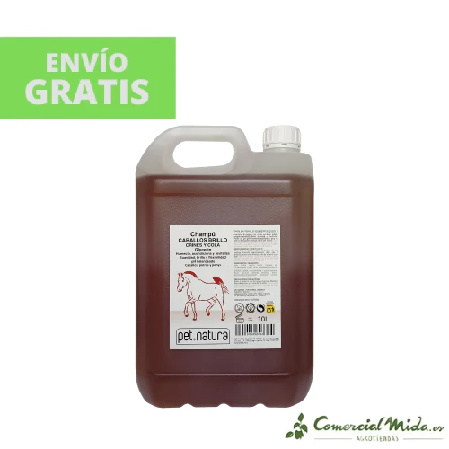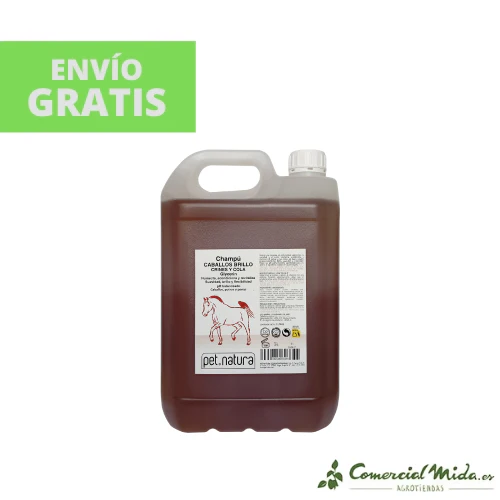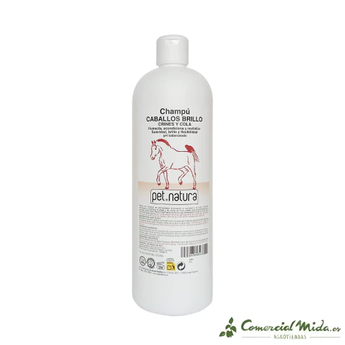 El champú especial de PetNatura para dar brillo a la crin y cola de los caballos es un gel de lavado con propiedades humectantes y acondicionadoras. La fórmula de este champú es suave, tiene un pH adaptado a la fisiología de cada animal y proporciona brillo, elasticidad, vitalidad y flexibilidad. Permite un buen control y mantenimiento del manto de los equinos, limpiando y eliminando todo rastro de suciedad, polvo y bichos que se acumulan en zonas delicadas como el pelo de la crin o la cola. Se recomienda su uso habitual para prevenir la debilitación del pelo, manchas cutáneas, infestaciones o la pérdida de fuerza y brillo del pelo. Este gel de lavado garantiza el estado y aspecto saludable, fuerte y robusto de los animales.