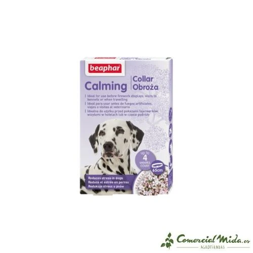 Calming de Beaphar es un collar relajante y antiestrés diseñado para reducir los problemas de comportamiento en perros de todas las edades, tamaños y razas. Ayuda a evitar ansiedad, ladridos excesivos y malas conductas, tranquilizando a las mascotas en momentos puntuales y situaciones de máximo estrés como pueden ser los viajes, las visitas al veterinario, separaciones o fuertes ruidos como los petardos. El collar está elaborado a base de componentes y plantas naturales como la lavanda y valeriana, conocidas por tener numerosas propiedades calmantes y tranquilizantes. El accesorio libera de manera progresiva los extractos de estas plantas consiguiendo aportar relajación y eliminar los síntomas de incomodidad; mejorando el comportamiento del perro. El efecto del collar dura hasta 6 semanas y es resistente al agua. Se puede usar como método preventivo y también si el perro ya está viviendo un periodo de estrés. Es recomendable que, si sabemos que se va a producir una situación que disgusta a nuestro fiel compañero, coloquemos el collar al menos 15 minutos antes para ir calmando sus nervios.