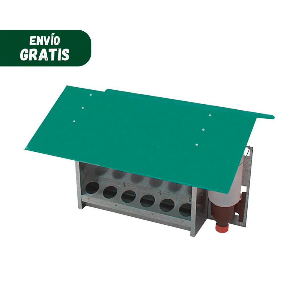 La combinación de comedero y bebedero para gallinas es una opción excelente para alimentar y administrar agua a cualquier gallina de corral o que disfrute de la libertad al al aire libre. Está fabricado en chapa galvanizada con techo de chapa lacada en color verde. Incorpora una botella bebedero de 2 litros de plástico. Dispone de 12 huecos, 6 por cada lado, para reducir el despilfarro de comida. Medidas: largo 70 cm, ancho 57 cm y alto 41 cm.