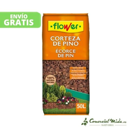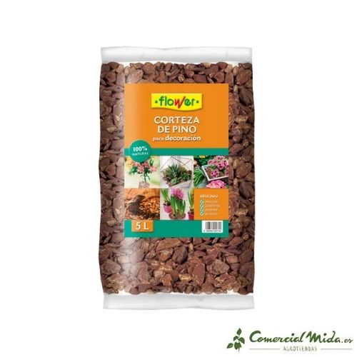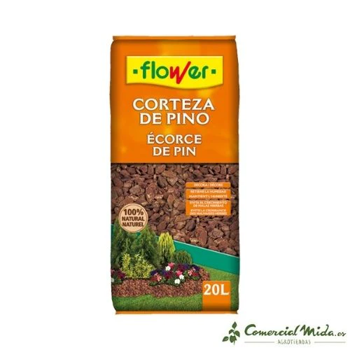 Corteza de pino con diferentes granulometrías (8/15, 15/30 o 30/50), completamente natural, diseñada para evitar el crecimiento de malas hierbas y economizar el riego.