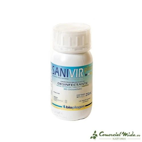 El desinfectante e insecticida Sanivir Plus de Bioplagen es un producto de amplio espectro que ayuda a eliminar todo tipo de microorganismos entre los que se encuentran bacterias, virus, esporas, hongos y mycoplasmas. También se encarga de controlar las plagas y la presencia de diferentes insectos y ácaros como moscas, mosquitos, pulgas, ácaros, garrapatas, piojos y cucarachas. Este desinfectante es emulsionable en agua y proporciona limpieza, desinfección y desinsectación en un mismo producto.