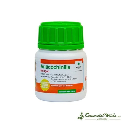 Anticochinillas Muligan es un efectivo insecticida para control de plagas de Cochinillas en diferentes cultivos como manzanos, melocotoneros, vid u ornamentales herbáceas entre otros; Piojo de San José en ciruelos, nectarinos o perales; Mosca Blanca en ornamentales leñosas y caparreta (Saissetia) en los olivos. Su alto poder insecticida destaca por su doble acción por contacto e ingestión. Se presenta en formatos de venta libre y uso JED de 10 y 100 ml en concentrado emulsionable (EC).