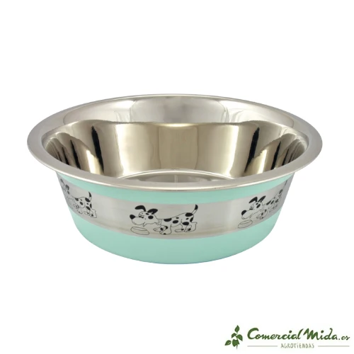 El comedero para perros Oslo de Nayeco cuenta con una goma en la parte inferior que impide que el cuenco se deslice por el suelo cuando nuestra mascota está comiendo. Está decorado con dibujos de perros que le dan un toque desenfadado.