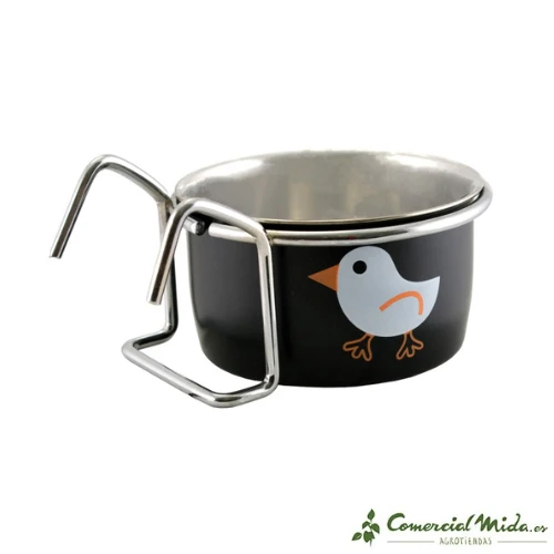 El comedero Pío para Jaula de Nayeco es un accesorio imprescindible en cualquier jaula de pájaros. Está decorado con un dibujo de un pájaro sobre fondo negro y pensado para encajar en los barrotes de cualquier jaula.