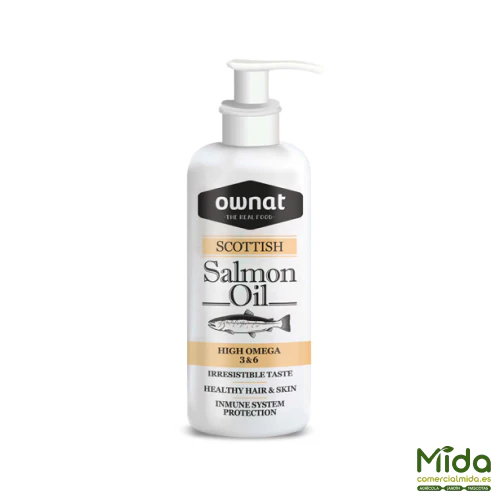 OWNAT Salmon Oil es un aceite de salmón con sabor altamente apetente para perros y gatos, formulado como complemento para aportar energía y un extra de ácidos grasos esenciales, especialmente omega 3. Su composición se basa en aceite de salmón escocés preservado con antioxidantes naturales (tocoferoles y extracto de romero), orientado a apoyar el estado de la piel y el pelo, así como el bienestar general.
