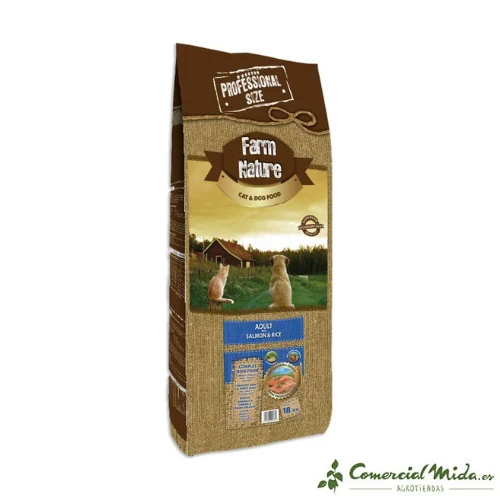 - Saco 18 Kg Farm Nature salmón y arroz. EAN 8414606901357.