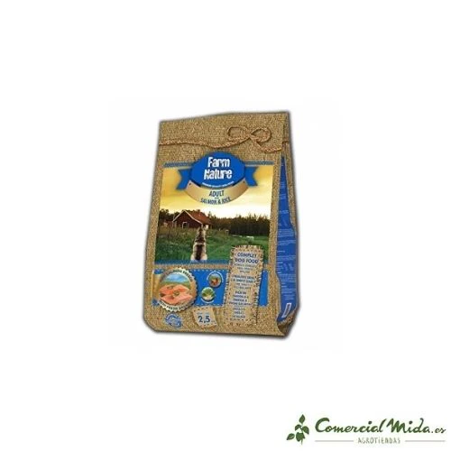 - Saco 2,5 Kg Farm Nature salmón y arroz. EAN 8414606901326.