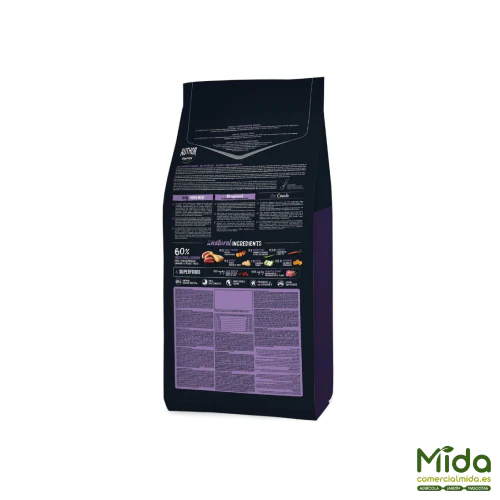 • 60% carne fresca total: combinación de pato y pollo frescos para alta palatabilidad y calidad proteica.