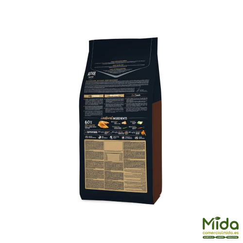 Gallo de corral fresco* (60 % mín. antes de la extrusión), patata deshidratada* (20 %), guisantes enteros* (7 %), grasa avícola (preservada con antioxidantes naturales), aceite de salmón (preservado con antioxidantes naturales), pulpa de remolacha, verduras y frutas frescas antes de la extrusión (manzana* 1 %, zanahoria* 0,5 %), vaina de algarroba*, sal gema*, raíces de achicoria (FOS)*, productos de levaduras (MOS), algas marinas deshidratadas*, glucosamina (500 mg/kg), yucca shidigera, arándanos* (200 mg/kg), semillas de chía* (150 mg/kg), condroitín sulfato (100 mg/kg), cúrcuma* (100 mg/kg), hinojo* (100 mg/kg). *INGREDIENTES NATURALES