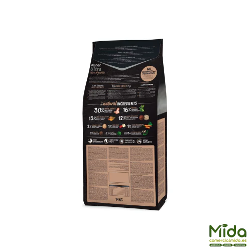El pienso Ultra Medium Light de Ownat es un alimento seco completo y nutritivo formulado especialmente para perros con un bajo nivel de actividad física o con tendencia al sobrepeso. Los ingredientes de la receta han sido minuciosamente seleccionados y cocidos muy lentamente a baja temperatura para conseguir la máxima calidad nutricional. La carne de pavo aporta nutrientes esenciales para el mantenimiento del sistema óseo y articular, los guisantes y las legumbres incorporan minerales y vitaminas vegetales indispensables para la fortaleza de los músculos, el aceite de salmón mejora la elasticidad y el brillo de la piel y el pelo y los cereales integrales facilitan el proceso digestivo. El contenido en materias grasas es muy reducido y este pienso es ideal para recuperar y mantener el peso ideal. La proporción entre proteínas y minerales es óptima y asegura un buen mantenimiento y tonicidad de los músculos. El tamaño de las croquetas se ajusta a la mandíbula de los animales para evitar los sobreesfuerzos o dificultad a la hora de ingerir la comida.