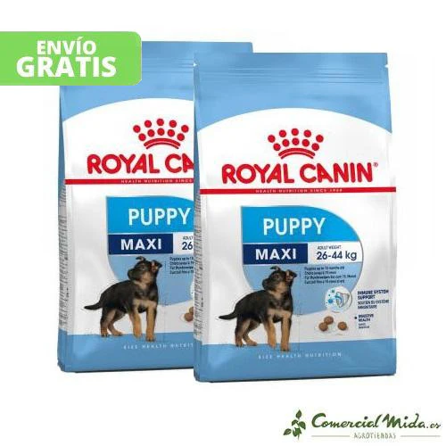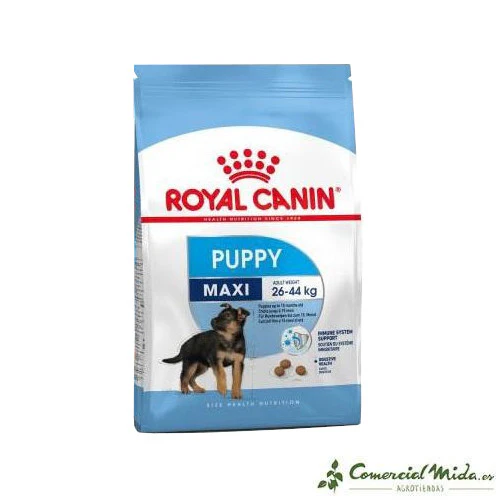 Royal Canin Maxi Puppy es un alimento para cachorros de razas grandes (maxi) de 26 a 44 kg hasta los 15 meses de edad. La combinación exclusiva de nutrientes Royal Canin garantizan una seguridad digestiva óptima y favorecen el equilibrio de la flora intestinal, contribuyendo así a mejorar la calidad de las heces. Este pienso seco está formulado para ayudar a reforzar las defensas naturales así como mantener los huesos y articulaciones fuertes. Por último, responde a las elevadas necesidades energéticas del cachorro de raza grande (maxi) qué tiene un largo período de crecimiento.