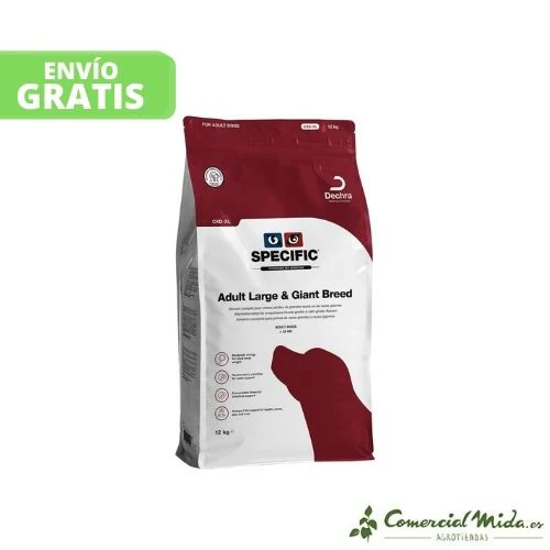 El alimento seco Adult Large & Giant Breed CXD-XL de Specific es un pienso que ha sido diseñado para satisfacer las necesidades nutricionales específicas de las razas de perros adultos grandes y gigantes. Cuenta con elevados niveles de fibra y los ingredientes son muy digeribles para contribuir a reafirmar las heces más blandas, muy comunes entre las razas de estos tamaños. Las croquetas son de un tamaño extra grande para estimular la masticación. En su composición destacan los niveles altos de Omega 3 de pescado y otros ingredientes que contribuyen a que la digestión sea saludable. Ayuda a controlar el peso corporal ideal gracias a los niveles moderados de energía. Este pienso apoya una vida activa y saludable.