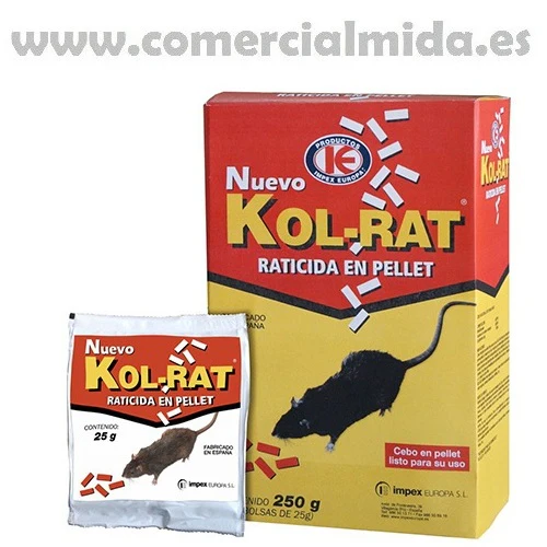 Cebo raticida en pellet listo para usar, indicado para la lucha contra ratas y ratones. KOL-RAT actúa por ingestión provocando la muerte de los roedores por hemorragias internas en pocos días sin despertar la desconfianza de los roedores por el cebo, lo que permite una desratización completa. Una vez intoxicados, los ratones y las ratas son invadidos por una sensación de sofoco y tienden a ir a morir al aire libre.