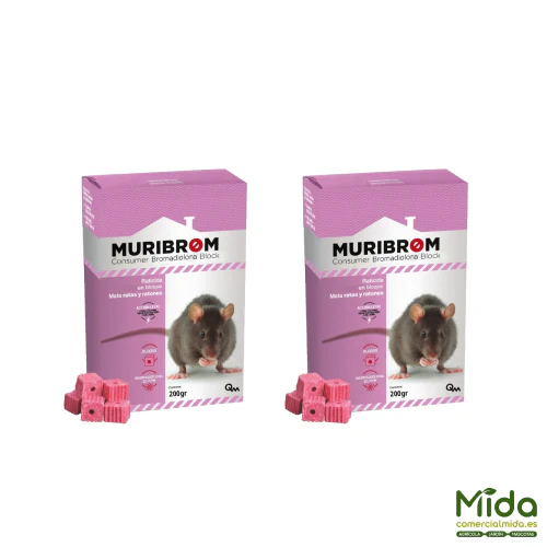 Cebo en bloques, listo para su uso. El producto MURIBROM BLOQUE elimina ratas y ratones. Los componentes de apetitosa atracción de este veneno, integrados en el cebo raticida, son percibidos por los roedores a extraordinaria distancia. Es efectivo a muy pequeñas dosis pero no produce efectos antes de las 48 horas incluso si se ingiere en altas dosis, lo que evita que el resto de las ratas y ratones desconfíen de los cebos y continúen comiéndolos.