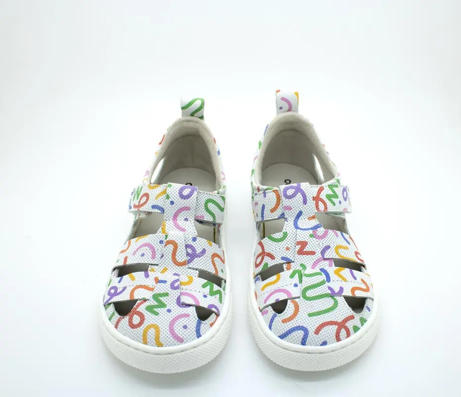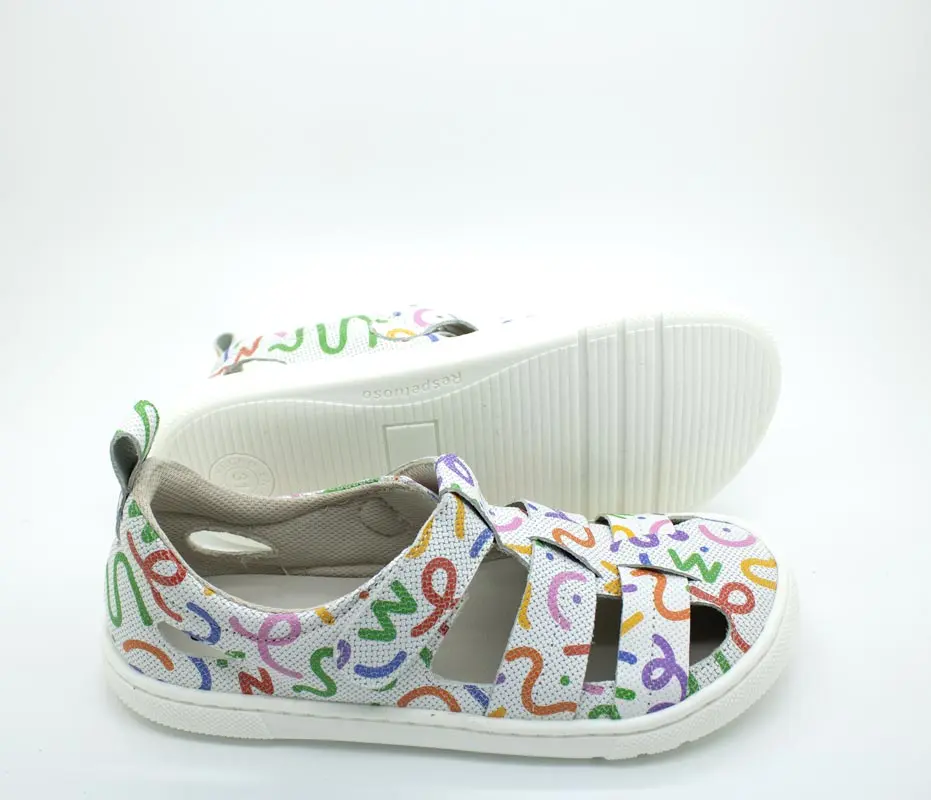 La suela es amplia, plana (drop cero) y flexible, lo cual proporciona una sensación de caminar descalzo y promueve el sano desarrollo de los pies de los niños. Además, cuenta con detalles antideslizantes, garantizando la seguridad en cada paso. La suela es de color blanco. La puntera está reforzada para garantizar una mejor resistencia al desgaste diario.