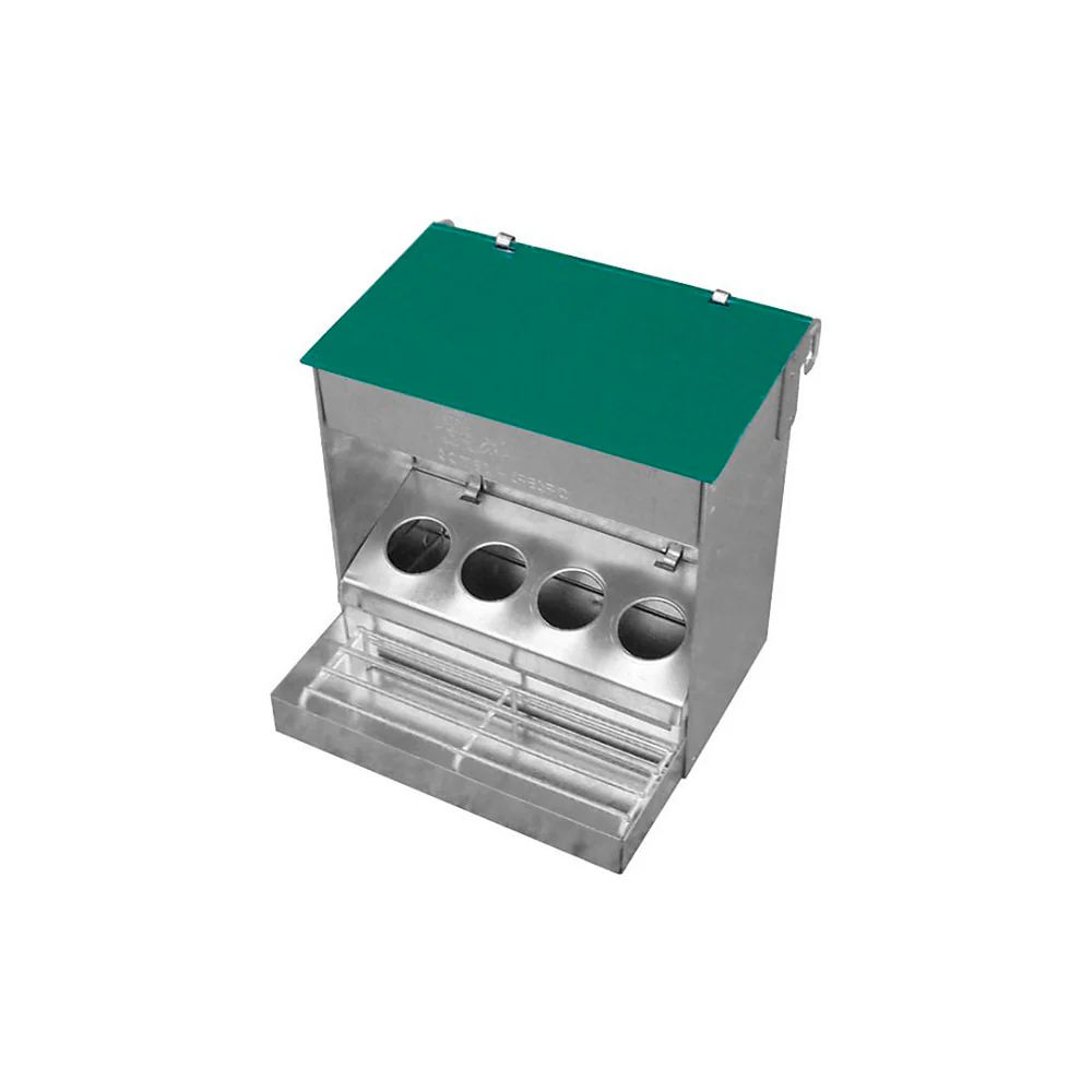 Comedero para canarios en voladero con cuatro huecos diferenciados. Incluye una tapa en la parte superior que protege el alimento de agentes externos. La tapa se cierra con una bisagra resistente. En la parte delantera de esta tolva de canarios incluye una plataforma con rejilla para que los canarios se apoyen y de ese modo, facilitar la acción de alimentarse. Comedero para alpiste de pájaros con huecos adaptados de 30 mm de diámetro. Está especialmente diseñado para su uso en voladeros de pájaros. Además, incluye unos ganchos que permiten sujetar el comedero en la rejilla.