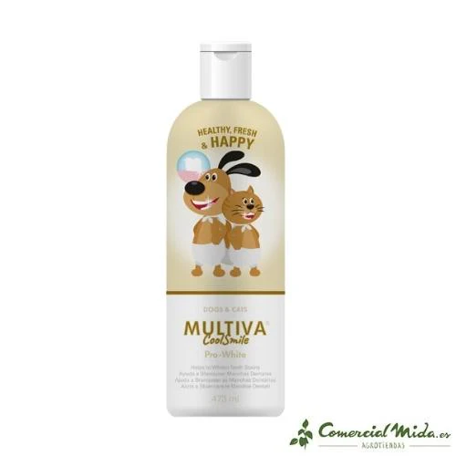 Multiva CoolSmile Pro White es una solución oral para ayudar a blanquear y reducir las manchas dentales de los perros y los gatos y ayudarles a mantener una buena salud oral. No contiene aromas artificiales, colorantes o azúcares lo que es ideal para poder usar a diario o a largo plazo.