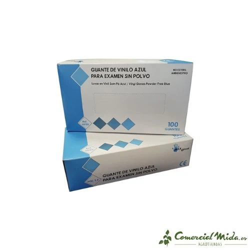 Guantes de examen 100% vinilo PVC de color azul libres de polvo o látex de uso desechable con tacto suave. Caja de 100 unidades.