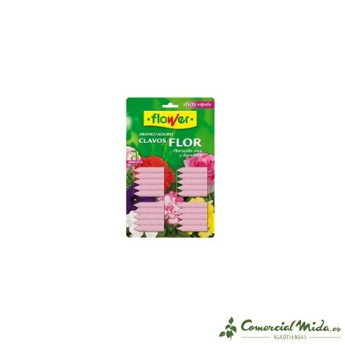El abono en clavos de Flower para flores es un tipo de abono compuesto que está diseñado para nutrir las plantas con flor de interior que se cultivan en macetas o las plantas de exterior plantadas en jardineras. Gracias a los componentes de esta fórmula, permite que las plantas estén completamente protegidas durante 30 días. Su composición es rica en potasio y fósforo y está pensada para inducir la floración de manera rápida. El modo de empleo es sencillo y solamente bastará con aplicar el abono en el sustrato, para su posterior riego. La materia que lo compone lo hace un elemento 100% orgánico y libre de productos o componentes tóxicos.