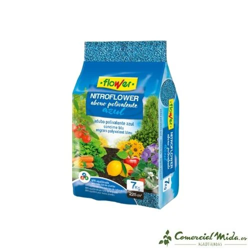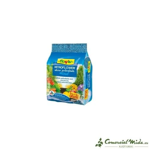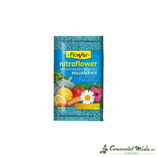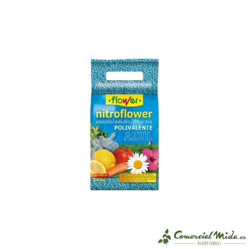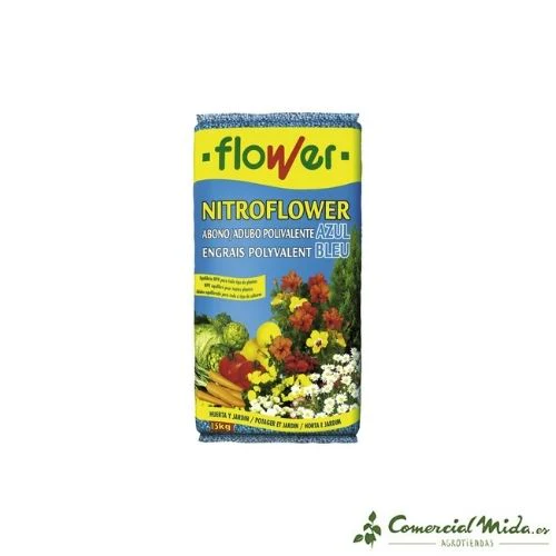 Nitroflower es un abono polivalente azul diseñado para su aplicación en jardinería y agricultura doméstica. Su aplicación es recomendable durante prácticamente todo el año para facilitar la absorción de todos los elementos esenciales que necesitan las plantas y el césped para un crecimiento, desarrollo y mantenimiento óptimos. Dicha aplicación deberá hacerse en función de las necesidades de cada tipo de cultivo o planta. Su formulación está hecha a base de nitrógeno, fósforo y potasio en proporciones equilibradas y en sintonía con otros microelementos como el magnesio, azufre y boro, que aseguran un amplio espectro de aplicación y eficacia. Es un abono que puede ser utilizado tanto en los momentos previos a la siembra o trasplante, como durante el ciclo de desarrollo de las plantaciones. Su grado de asimilación y solubilidad es alto y de rápido aprovechamiento por parte de la planta una vez aplicado al suelo. Además, favorece el engorde de los frutos en las plantas de huerta (hortalizas, frutales y cítricos).