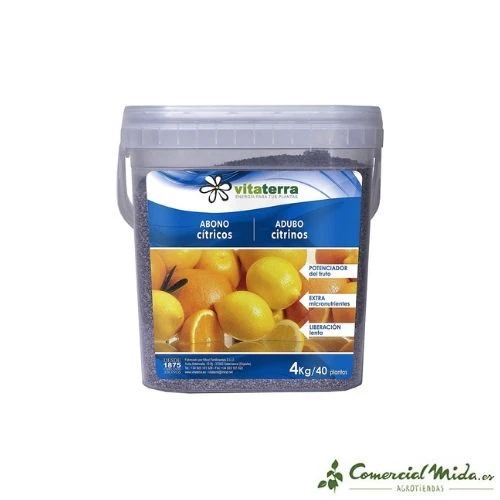 El abono granulado de Vitaterra para la aplicación en cítricos es ideal para limoneros, naranjos y mandarinos, entre otros. Atiende a las necesidades nutritivas de los cítricos para que se mantengan fuertes y sanos, creando un equilibrio entre el crecimiento y la producción. Favorece una fructificación completa, obteniendo frutos grandes y sabrosos. Contiene una elevada dosis de potasio, que ayuda a restituir el reparto y la absorción de nutrientes por todas las partes de las plantas, además de garantizar una correcta coloración y dulzura de los frutos. Se trata de un producto de lenta liberación, que permite la perfecta sincronía entre degradación y liberación del abono y en función de las necesidades de cada planta.