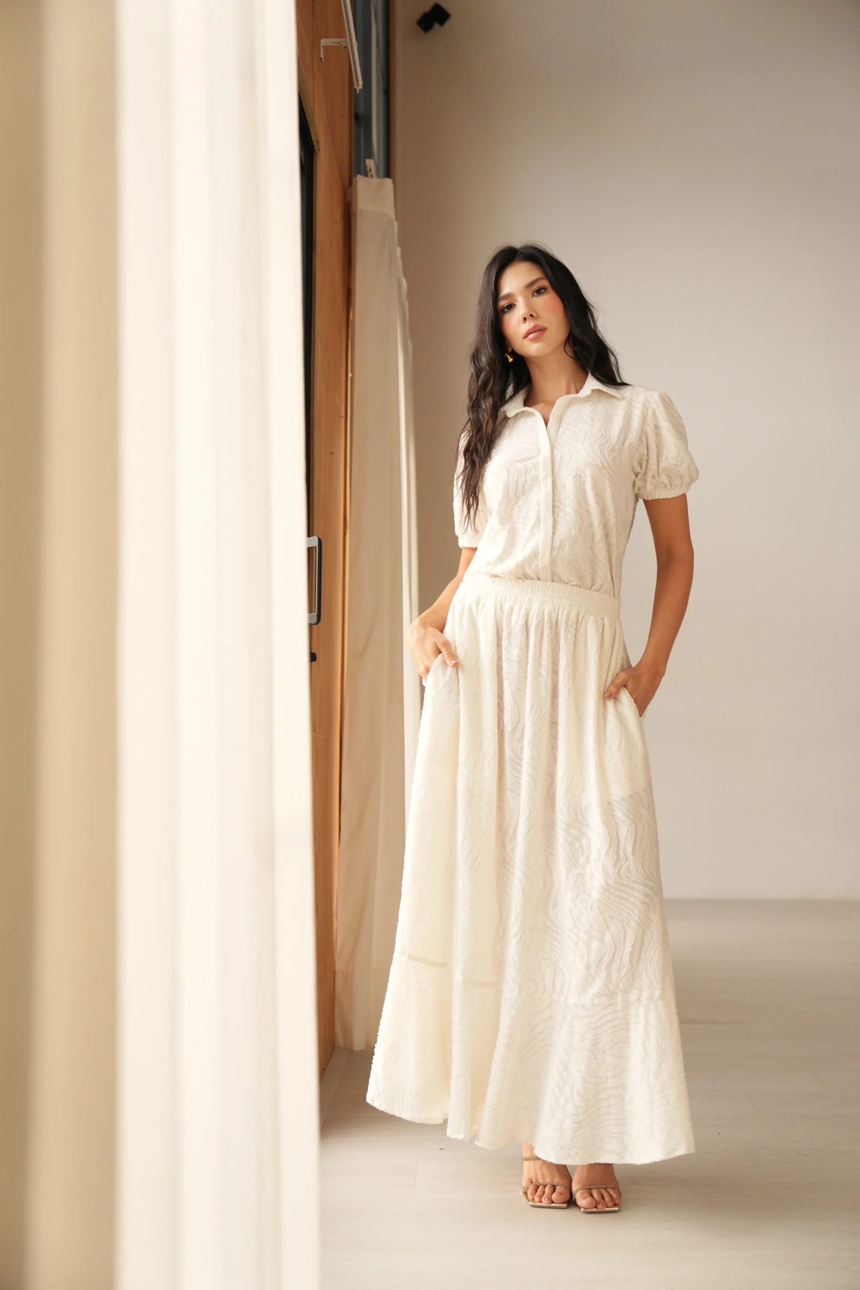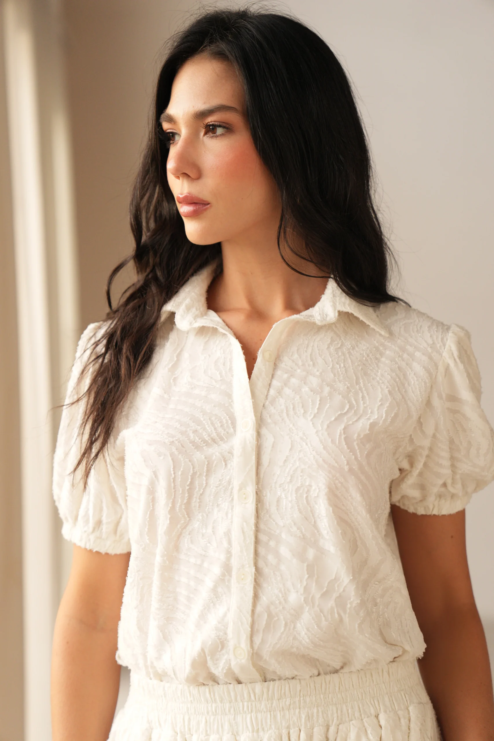 Blusa manga corta con elástico en puño, cuello camisero, botones en frente, tela con textura y suave al tacto