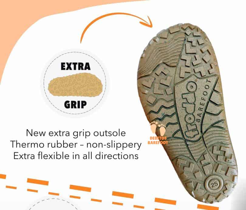 Con puntera ancha que permite que los deditos se sientan libres y se muevan con total libertad. La suela es plana con drop cero, ofreciendo una gran flexibilidad.