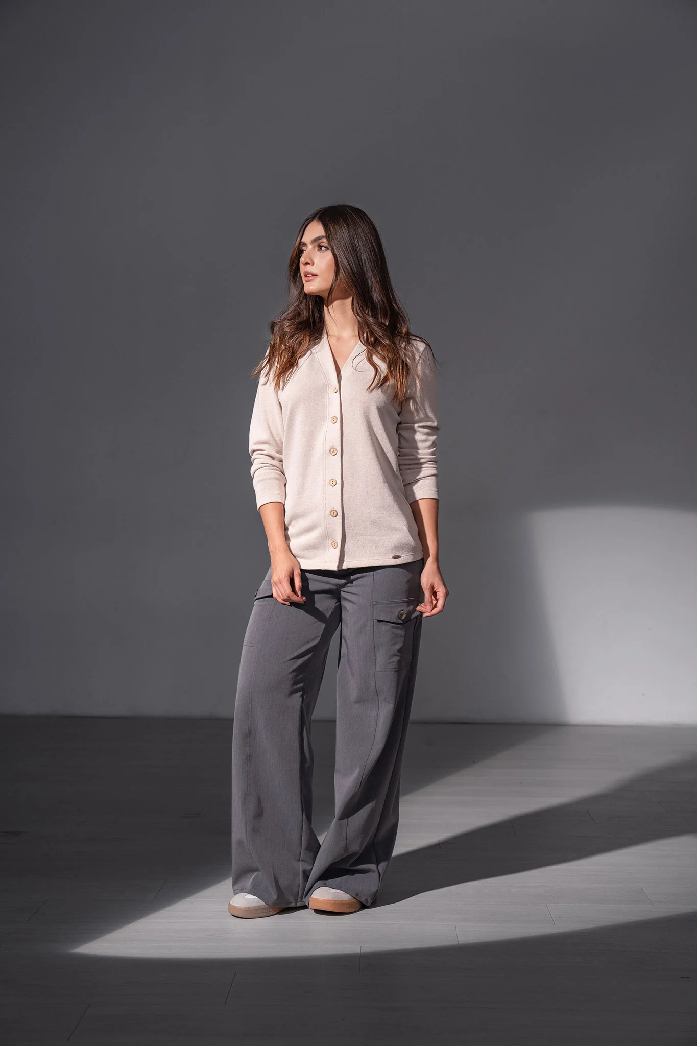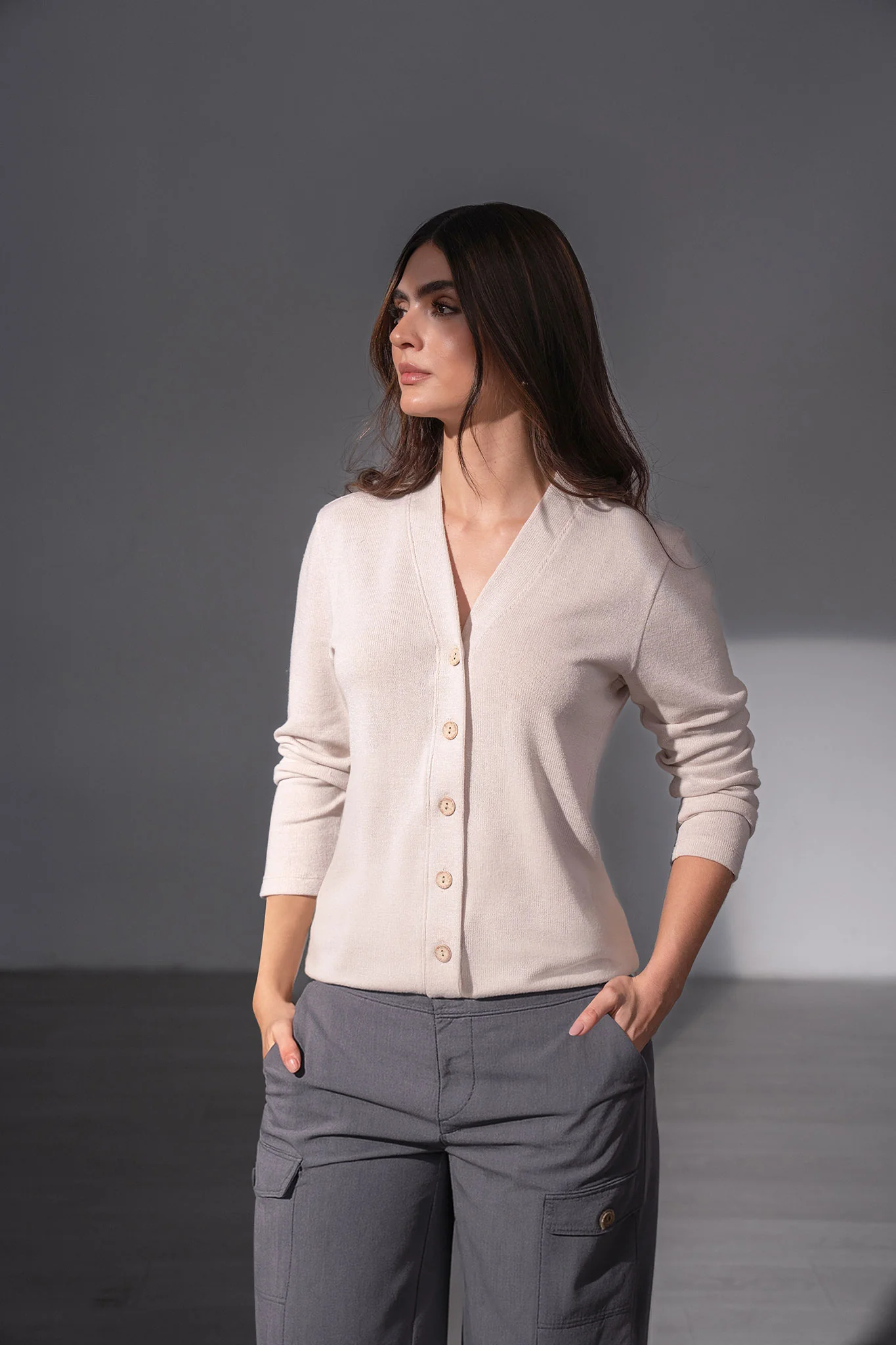 Buso con botón en perilla, botones en frente, tela con textura, cuello en v