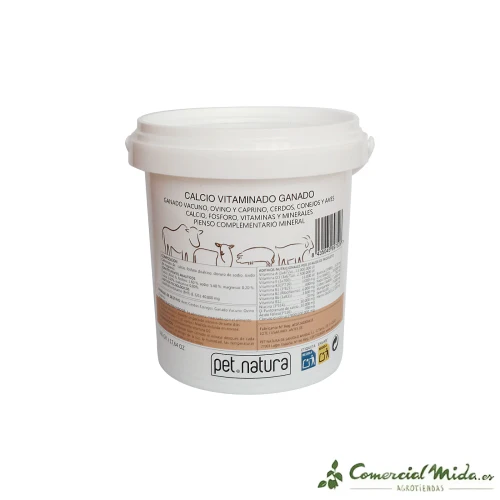 El calcio vitaminado de PetNatura es un tipo de pienso complementario mineral para conejos, aves, cerdos y ganado vacuno, ovino y caprino. Fórmula completa y enriquecida con vitaminas y minerales, en formato de polvo oral. Completa y mejora la dieta del ganado durante los periodos de mayor exigencia nutricional como la reproducción, gestación, puesta, lactancia y desarrollo. Funciona como protector y fortalecedor en estados de convalecencia, desnutrición, debilidad y estrés. Contiene propiedades estimulantes del apetito y cubre las deficiencias de vitaminas esenciales para que nos animales gocen de una salud óptima y completa.