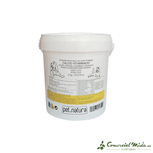 El calcio vitaminado de PetNatura es un suplemento nutricional completo que cubre las necesidades y posible falta de calcio y fósforo en la alimentación y salud de las mascotas. Aporta vitaminas y nutrientes esenciales a las comidas diarias para asegurar un buen crecimiento, una correcta dosificación y un esqueleto fuerte en perros y gatos. Fortalece y protege los huesos, los dientes y unas articulaciones flexibles y sanas. Eficaz suplemento nutritivo para animales gestantes y lactantes, para perros y felinos mayores que necesitan un aporte adicional de energía y para mascotas que se enfrentan a situaciones de mayor esfuerzo físico, a estados de convalecencia, desnutrición, estrés o poco apetito. Se presenta en formato en polvo que permite una fácil disolución en la comida.