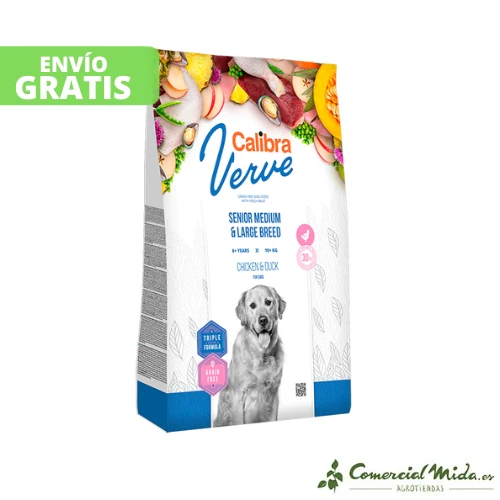 El pienso Dog GF Verve de Calibra es un alimento completo seco sin cereales para perros senior de razas grandes que pesen más de 10 kilos y cuya edad supere los 7 años. Es rico en ácidos boswélicos para ralentizar la degeneración de las articulaciones y silimarina para las funciones hepáticas.