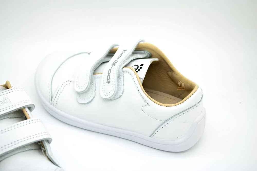 Este modelo respetuoso de calzado barefoot infantil lleva el sistema de ajuste y regulación con DOS velcros en color gris claro.