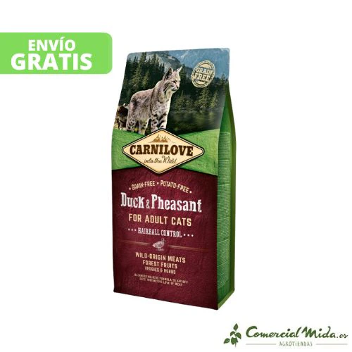Este comida está compuesta con ingredientes de gran calidad para que sea un alimento de lo más completo con un alto contenido en carne pero sin cereales ni patatas. Esta comida contiene pato y faisán que son fácilmente digeribles y contienen una gran cantidad de fibra natural que facilita el paso de las bolas de pelo a través del tracto digestivo, además de que ayudan a reducir la cantidad que se forma.