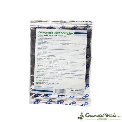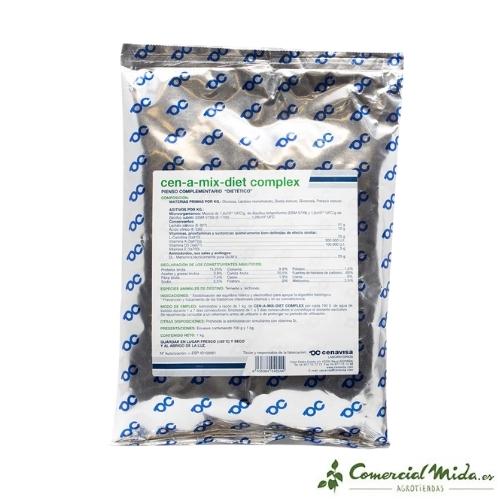 Cen-a-mix-diet Complex es un pienso complementario dietético para terneros y lechones en polvo para este tipo de animales de producción que requieran un suplemento alimenticio para estabilizar el equilibrio hídrico y electrolítico. Normalmente Cen-a-mix-diet Complex se utiliza en animales como tratamiento preventivo y curativo de problemas intestinales, por lo general diarreas y en los períodos de convalecencia posteriores. Cen-a-mix-diet Complet también suele ser utilizado por ganaderos como ayuda para tratar terneros y lechones con avitaminosis o falta de vitaminas.