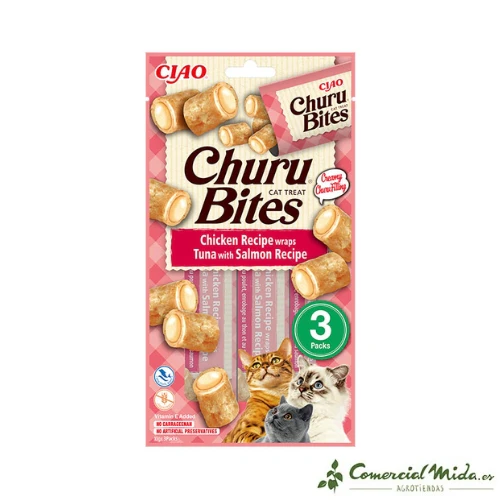El Snack para gatos Churu Bites con atún y salmón es un alimento exento de conservantes y colorantes compuesto de salmón, atún, extracto de te verde y vitamina E. Cada pack incluye tres paquetes individuales para facilitar la conservación y frescura del snack.