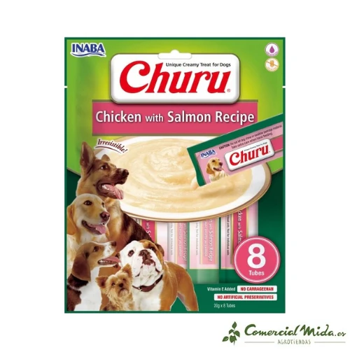 El Snack Churu Dog en forma de Crema de pollo con salmón está compuesto por ingredientes naturales y libre de conservantes y colorantes. El alto contenido en pollo y salmón aporta colágeno y omega 3 para ayudar a las articulaciones y al pelaje de nuestro perro.