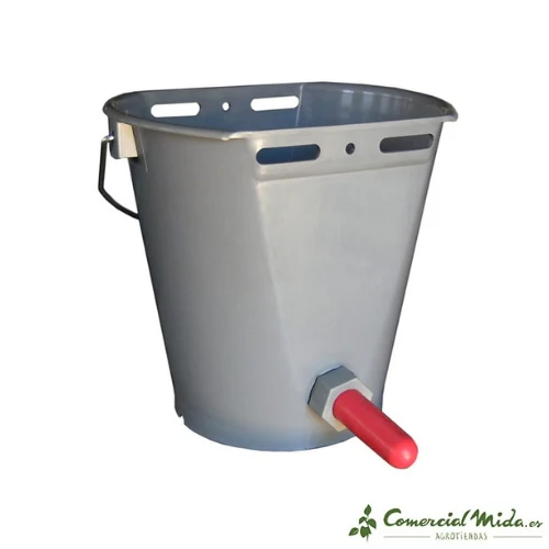 Este cubo cuenta con una escala para controlar la cantidad de leche que le estamos administrando al ternero. La tetina está situada en la parte frontal y cuenta con una válvula acodada que impide la salida de posos.