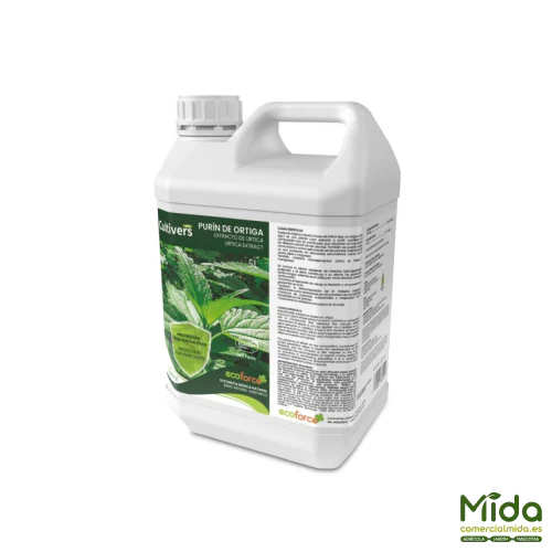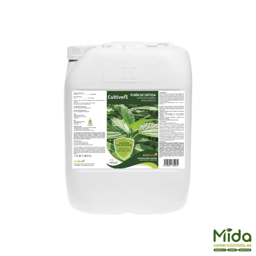 El Purín de Ortiga está formulado a base de Urtica spp., una sustancia básica natural utilizada para reforzar el mecanismo de defensa de las plantas. Puede aplicarse como abono o como bioestimulante, especialmente cuando el cultivo necesita recuperar vigor. Su composición aporta elementos secundarios como azufre, silicio y magnesio, además de microelementos como hierro y manganeso. Se asocia a un efecto repelente de insectos, principalmente pulgones, y a un apoyo preventivo frente a hongos gracias al papel del silicio. Favorece procesos fisiológicos vinculados al desarrollo de raíces y la floración, y puede contribuir al aumento de grados Brix en fruto.