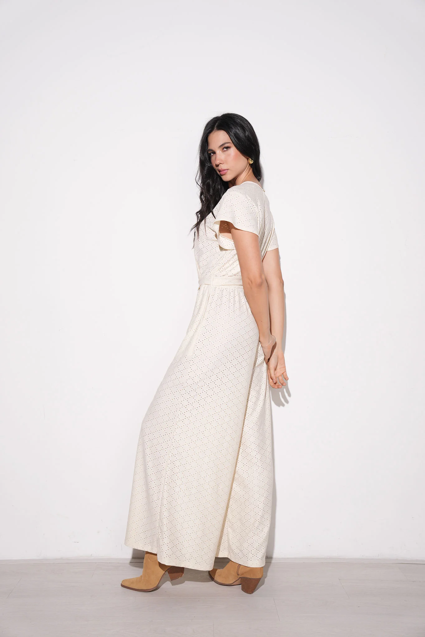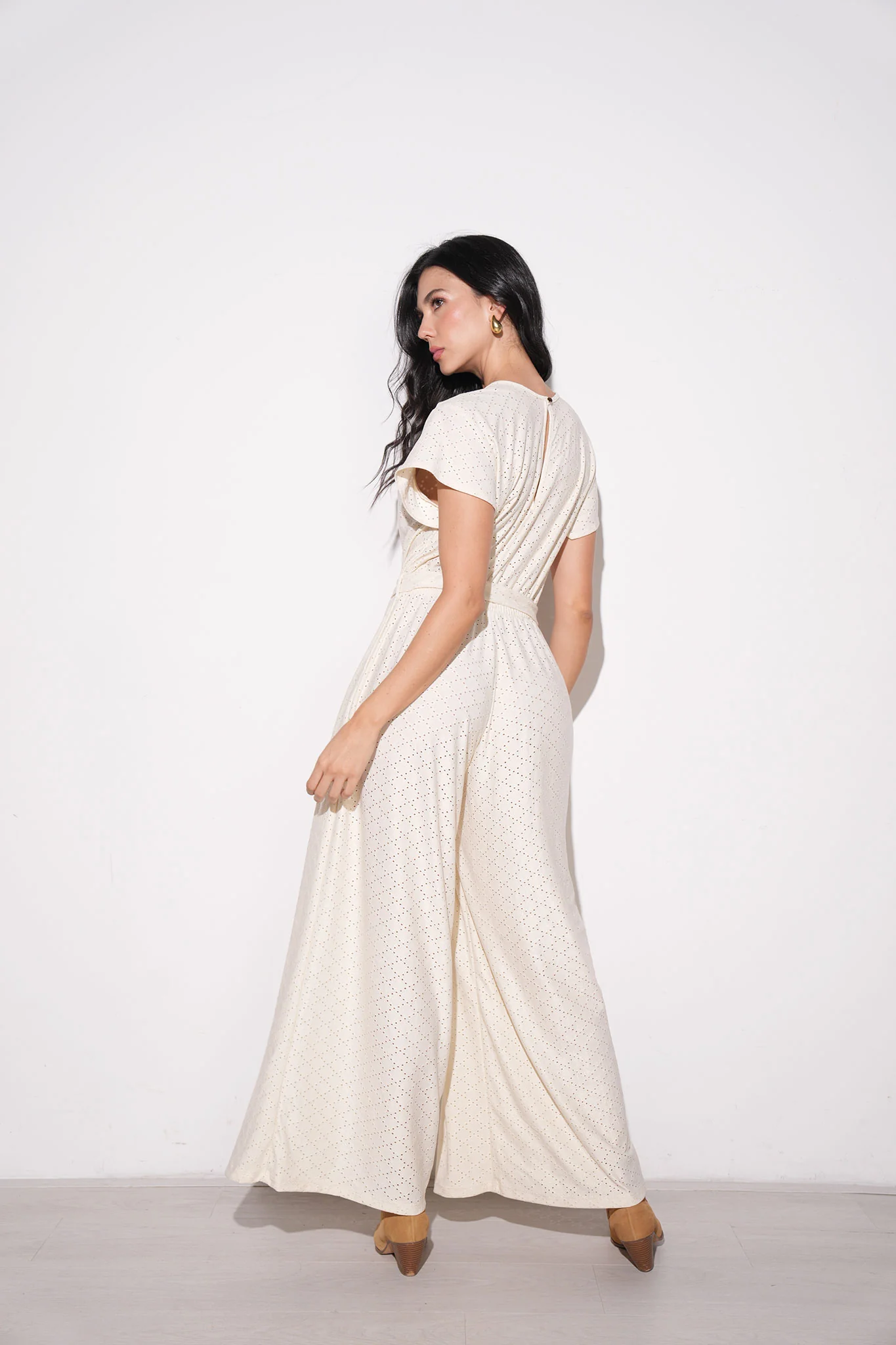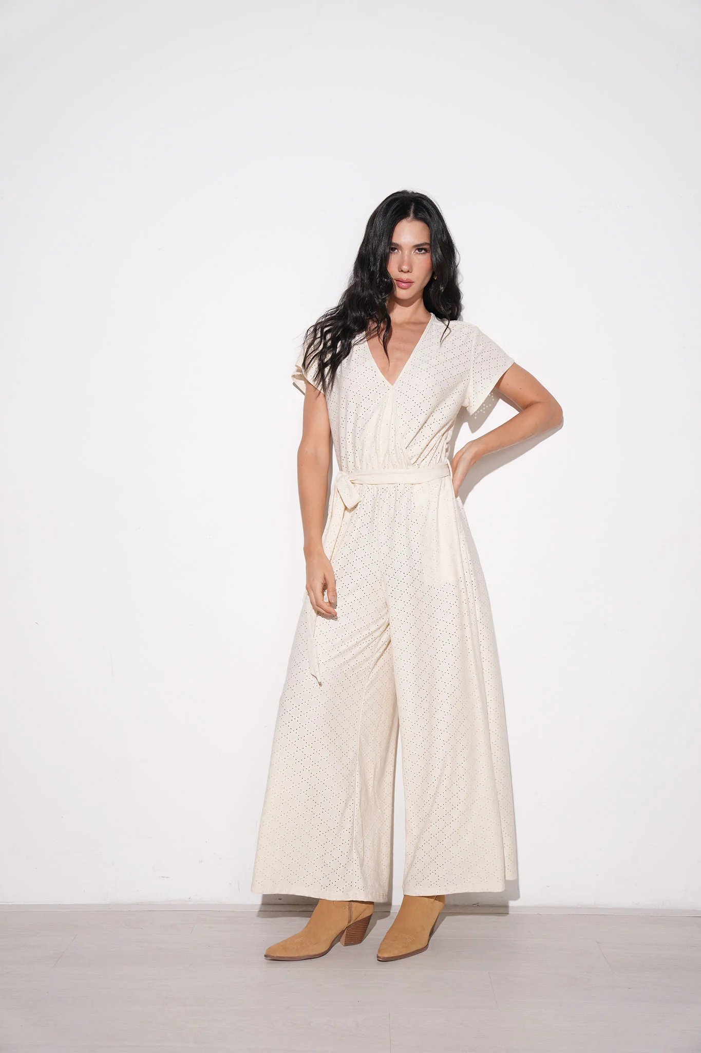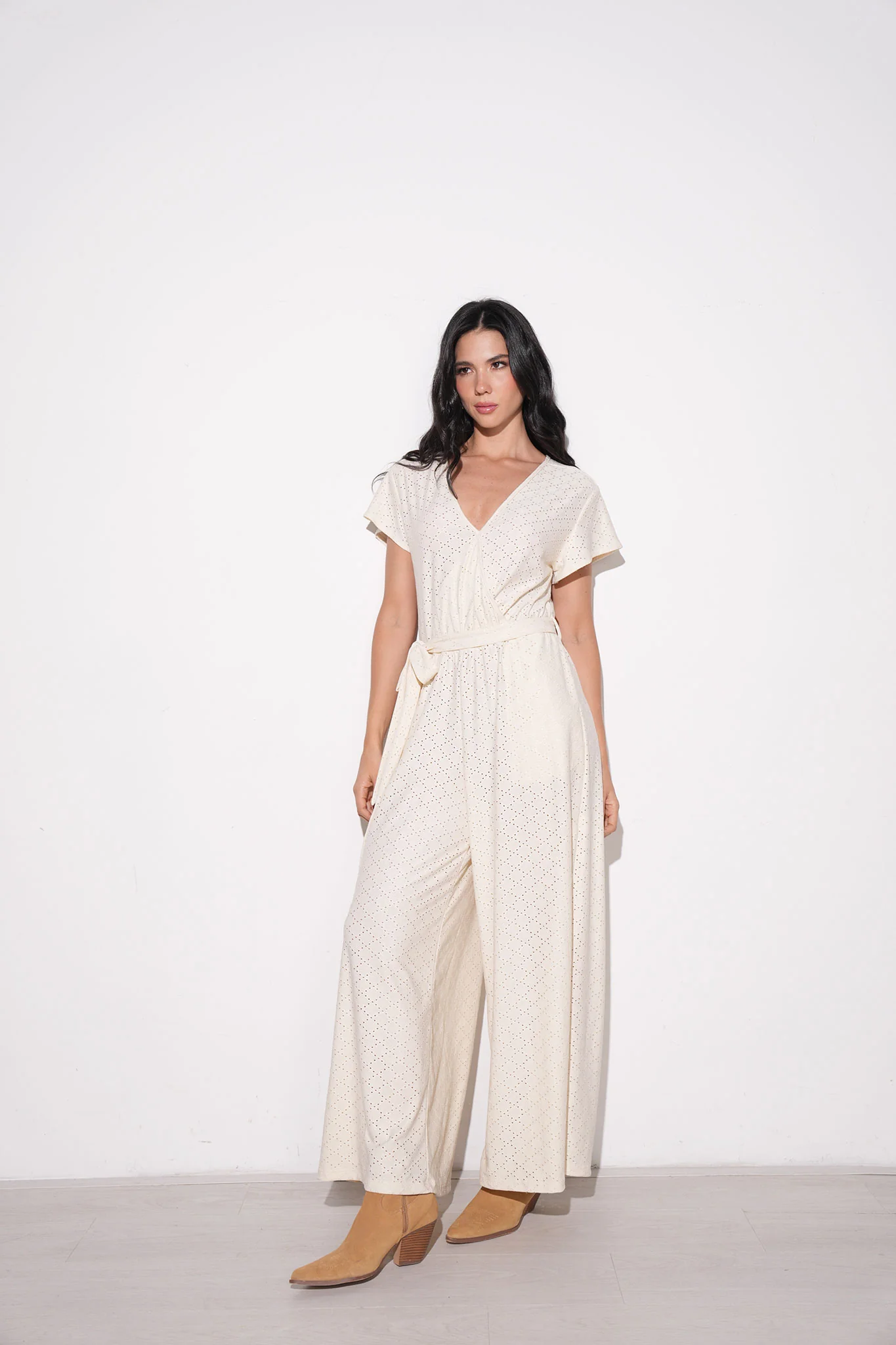 Enterizo bota palazzo, escote cruzado, tela con textura, manga corta