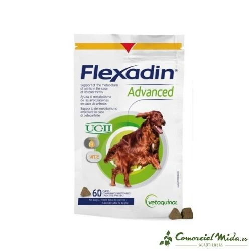 Suplemento alimenticio para perros con casos de osteoartrosis, que requieran un fortalecimiento del mecanismo articular. Es ideal para el tratamiento y la regeneración de ligamentos, articulaciones y tendones en casos de desgaste como artrosis. Contiene UC-II para la regeneración del cartílago y ácidos grasos Omega 3 que ayudan al fortalecimiento de las articulaciones. La Vitamina E aporta los antioxidantes necesarios para un buen desarrollo. Formato tipo golosina que facilita la palatabilidad y la digestión. Flexadin Advanced de Vetoquinol incluye extracto de Boswelia Serrata, que cuenta con propiedades calmantes, analgésicas y antiflamatorias, por lo que calman el dolor y las molestias ocasionadas por ese problema.