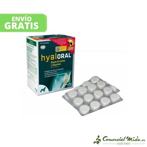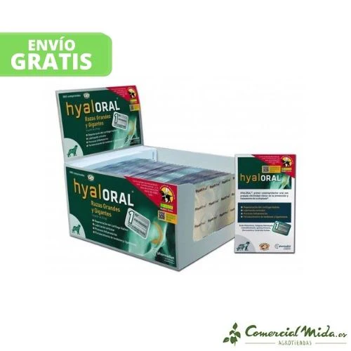 Suplemento alimenticio Hyaloral para perros de raza grande y gigante. Condroprotector en formato comprimido que regenera el cartílago, fortalece las articulaciones y los ligamentos. Contiene diferentes componentes que favorecen la regeneración como son el colágeno porcino y la glucosamina que ayuda a la función de movimiento de la articulación. Este complemento está indicado especialmente para perros con algún problema de desgaste en los huesos como artrosis causada por la edad o el sobrepeso del animal. Estos comprimidos aportan la lubricación necesaria para facilitar la flexibilidad y el movimiento en perros de gran tamaño con un peso mayor de 20 kg. Reduce la inflamación en las articulaciones.