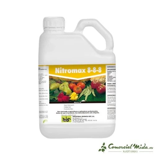 El abono para plantas Nitromax 8-8-8 de Key es perfecto para actividades de agricultura. Este abono con micronutrientes es apto para frutales de hueso y pepita, cítricos, olivo, vid, industriales, cereales, semilleros, forrajes, algodón, ornamentales y hortícolas.