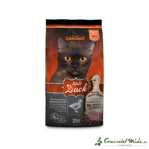 LEONARDO Adult Duck es la elección perfecta para proporcionar a tu gato una dieta equilibrada y sabrosa, especialmente si es amante de la carne de ave y necesita una atención especial debido a intolerancias alimentarias o problemas digestivos.