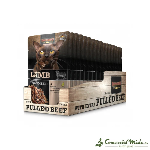 LEONARDO Lamb + Extra Pulled Beef es la elección ideal para proporcionar a tu gato una comida sabrosa, nutritiva y que mejora la salud de su pelaje, asegurando que disfrute de cada bocado.