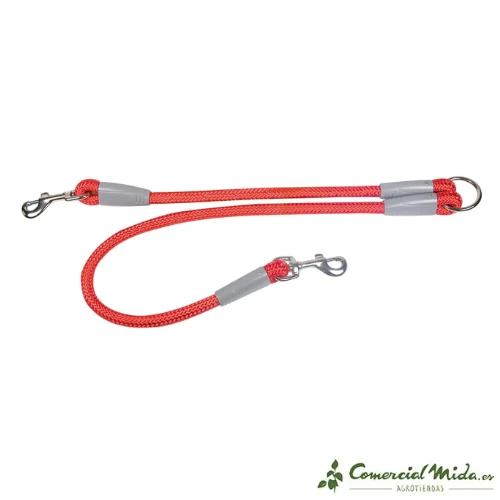Este artículo está construido en nylon trenzado en forma de cuerda gruesa, lo que lo dota de gran robustez y durabilidad frente a tirones. Su argolla está hecha de acero inoxidable al igual que sus mosquetones los cuales pueden girar 360º para evitar enredos.