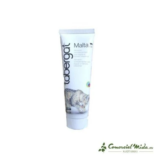 Tabergat Malta de DFV para gatos es una pasta que se administra a los gatos con el fin de regular su tránsito, este suplemento alimentario será muy apetitoso para el felino gracias a su elaboración con productos naturales que cuentan con propiedades laxantes. Gracias a esto se consigue regular el tránsito intestinal, ayudando a evitar la formación de bolas de pelo y los casos de estreñimiento. Este producto completará la dieta del animal y mejorará su estado de salud. Para garantizar que el minino ingiere de manera voluntaria este producto se recomienda depositar la dosis indicada por el fabricante en el hocico o en la pata para que este la ingiera en el momento en el que se acicale.